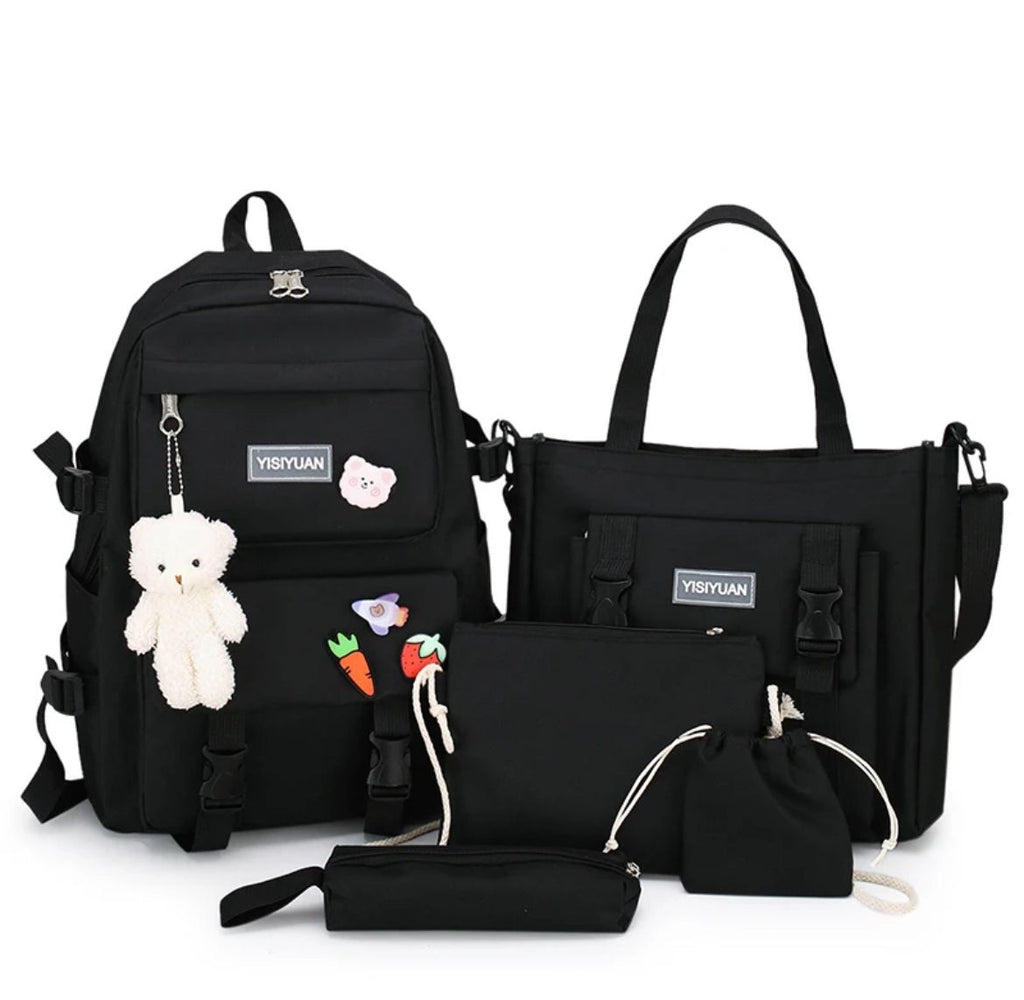 El set incluye una mochila, una bandolera, una bolsa de mano, una bolsa de papelería y un monedero, todos diseñados para satisfacer diversas necesidades. La mochila es ideal para libros y portátiles, mientras que la bandolera es perfecta para llevar artículos personales. La bolsa de mano ofrece un espacio adicional para artículos de uso diario, y la bolsa de papelería mantiene todos tus útiles organizados. El monedero es perfecto para llevar dinero y pequeños accesorios. Cada pieza está diseñada para ser práctica y funcional, adaptándose a cualquier situación.